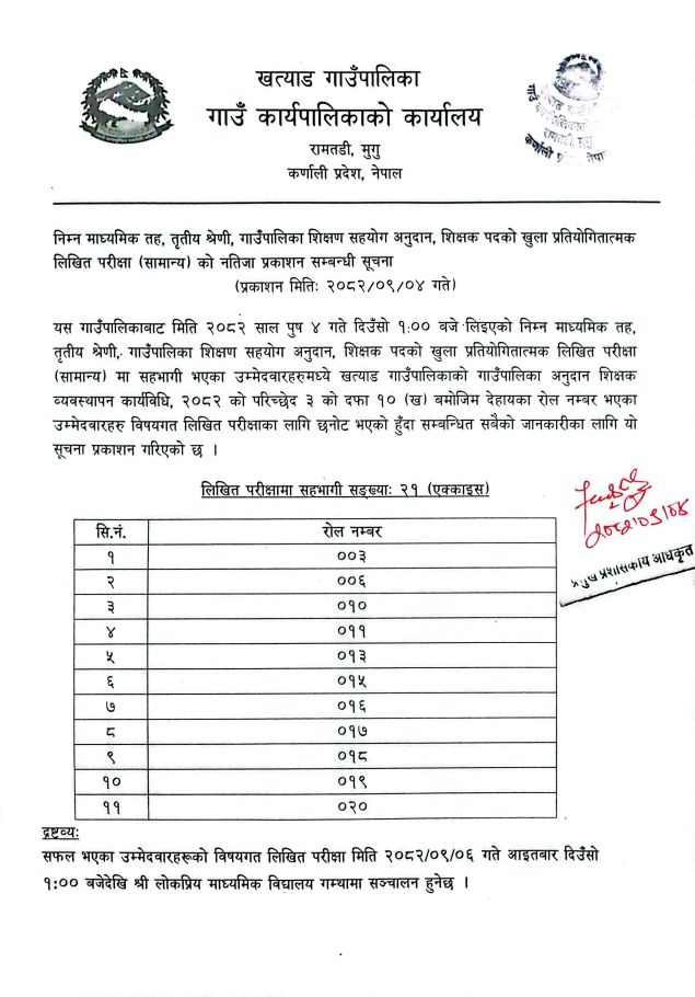 नि.मा.वि.तह शिक्षण सहयाेग अनुदान, शिक्षक पदकाे खुला प्रतियाेगितात्मक लिखित परीक्षा (सामान्य) काे नतिजा प्रकाशन सम्बन्धि सूचना ।